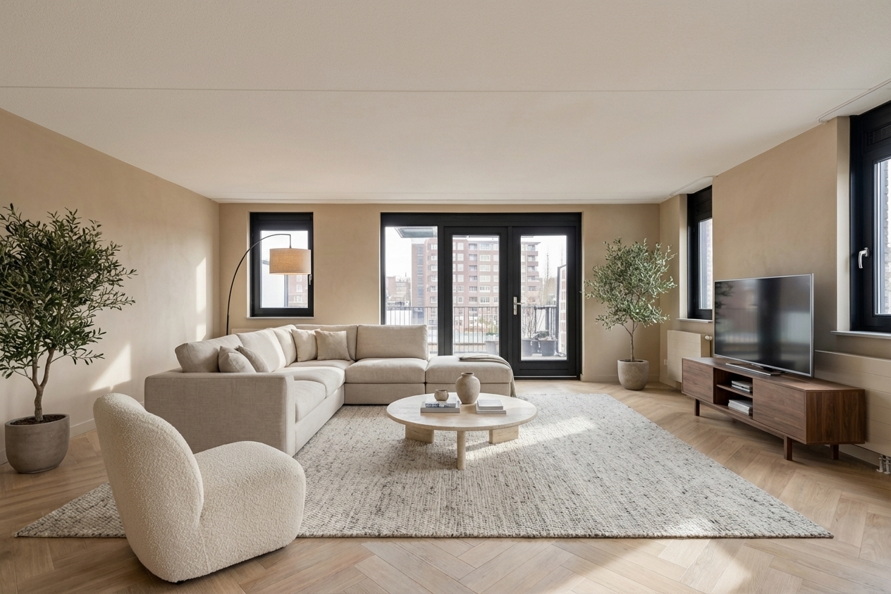 Andere tools plakken Amerikaanse interieurs over je foto. Wij trainen het model op Nederlandse kamers — met hun vierkante ramen, houten vloeren en te kleine L-vorm keukens.